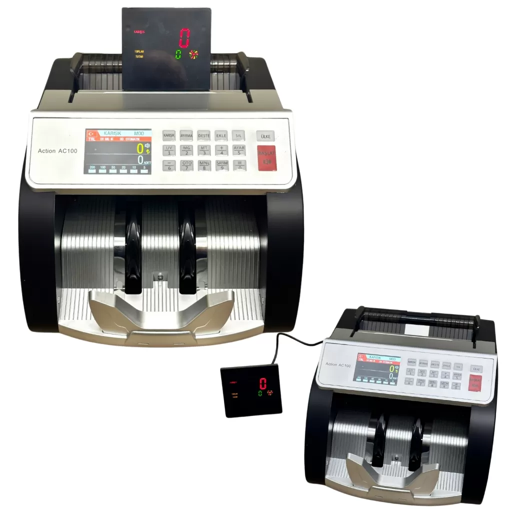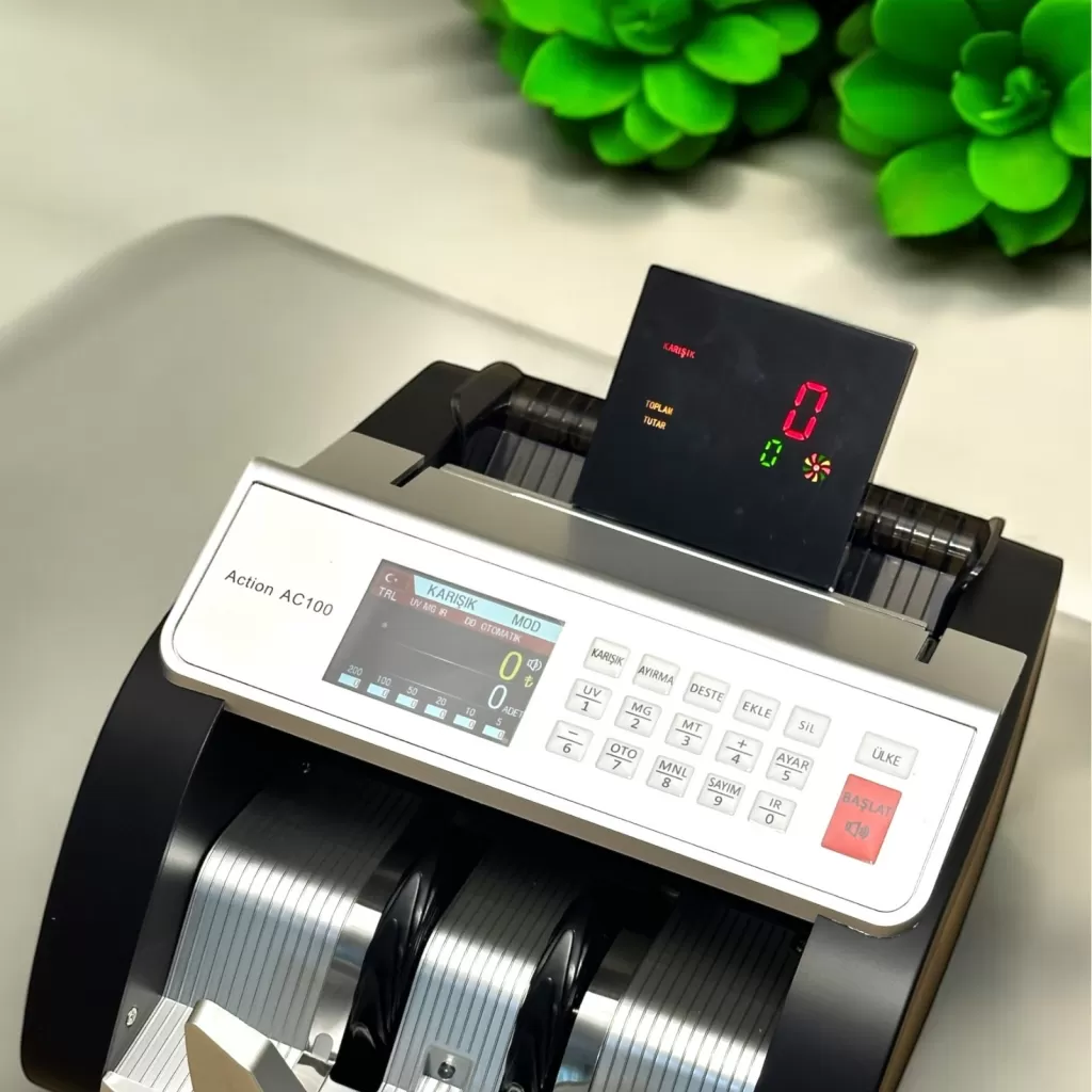 TL / EURO saymak ve sahtesini tespit etmek isteyen, kompak ve hesaplı para sayma makinesi ihtiyacı olan işletmeler için distribütör garantisi ile Action AC100 TL / EURO Kağıt Para Sayma Makinesi Kağıt Para Sayma Makinesi yeni nesil para sayma makinesi.